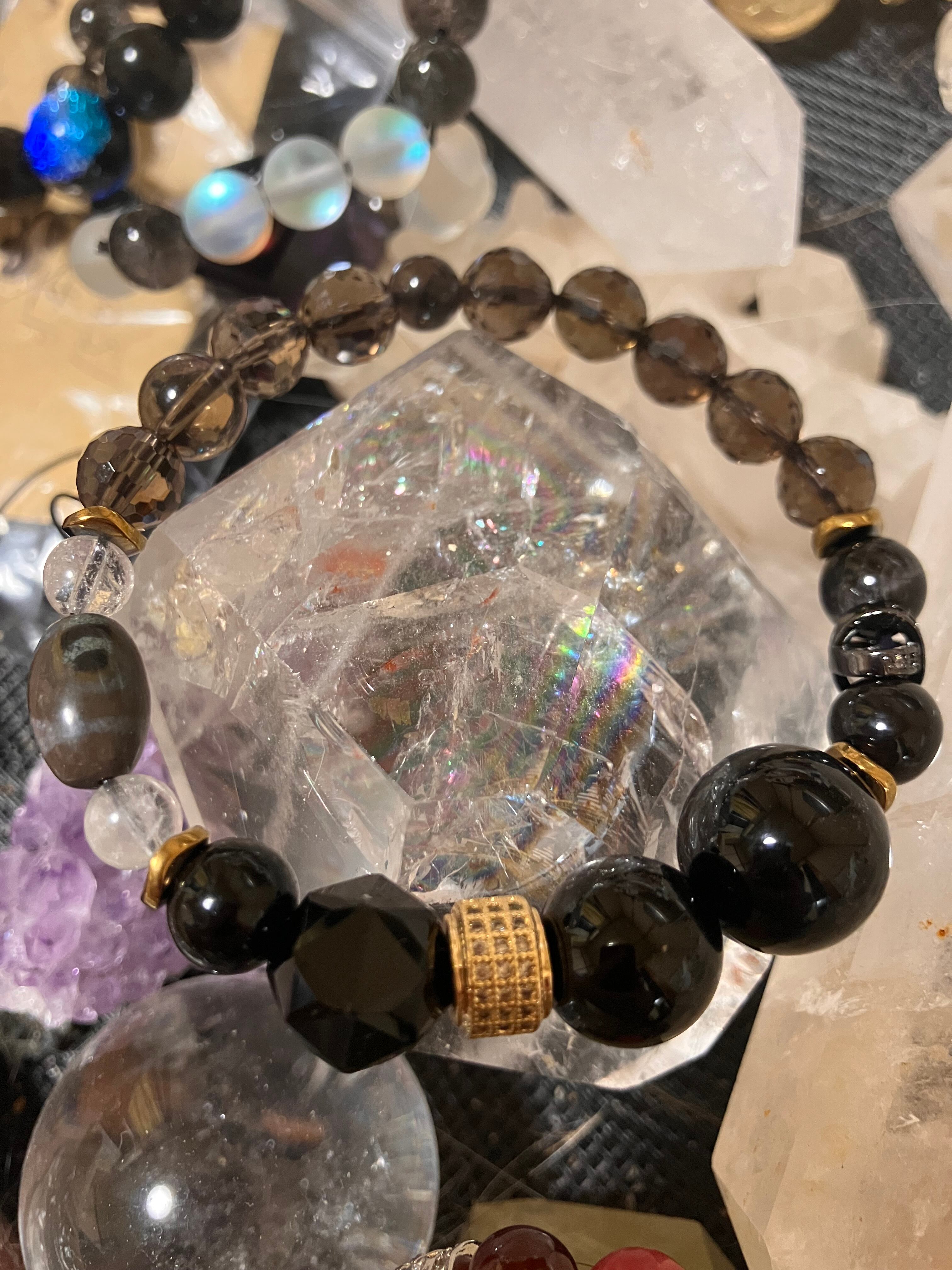 このブレスレットは、モリオンとスモーキークォーツの力で、深いグラウンディングと強力な守護 をもたらします。